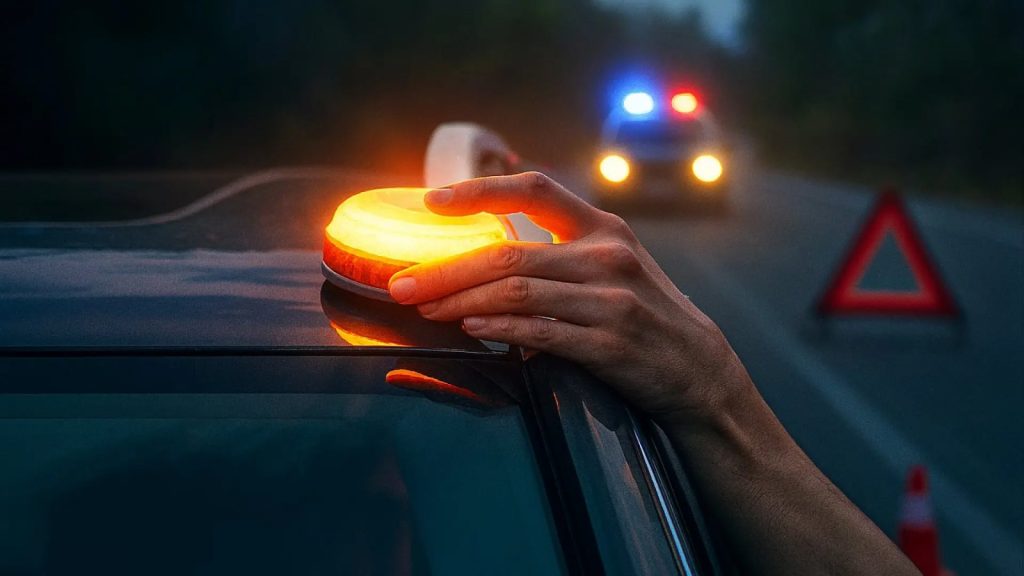 - Setzen Sie die Warnleuchte auf das Fahrzeugdach. Stellen Sie sicher, dass sie fest sitzt.